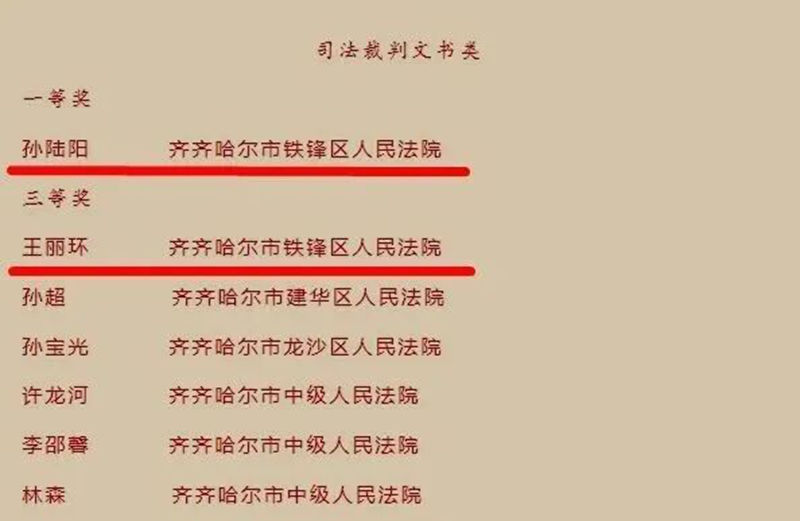 为深入学习研究宣传贯彻习近平法治思想,认真贯彻落实中共中央办公厅、国务院办公厅《关于加强新时代法学教育与法学理论研究的意见》以及中央政法工作会议部署要求,进一步提高法律工作者的文书写作能力,推动法律文书规范化建设,以高质量优秀法律文书促执法司法质效提升,省委政法委、省法学会联合开展黑龙江省优秀法律文书评选,齐齐哈尔政法系统共有18篇法律文书荣获奖项。其中,铁锋区人民法院成果丰硕,获司法裁判文书类一等奖1篇,三等奖1篇。