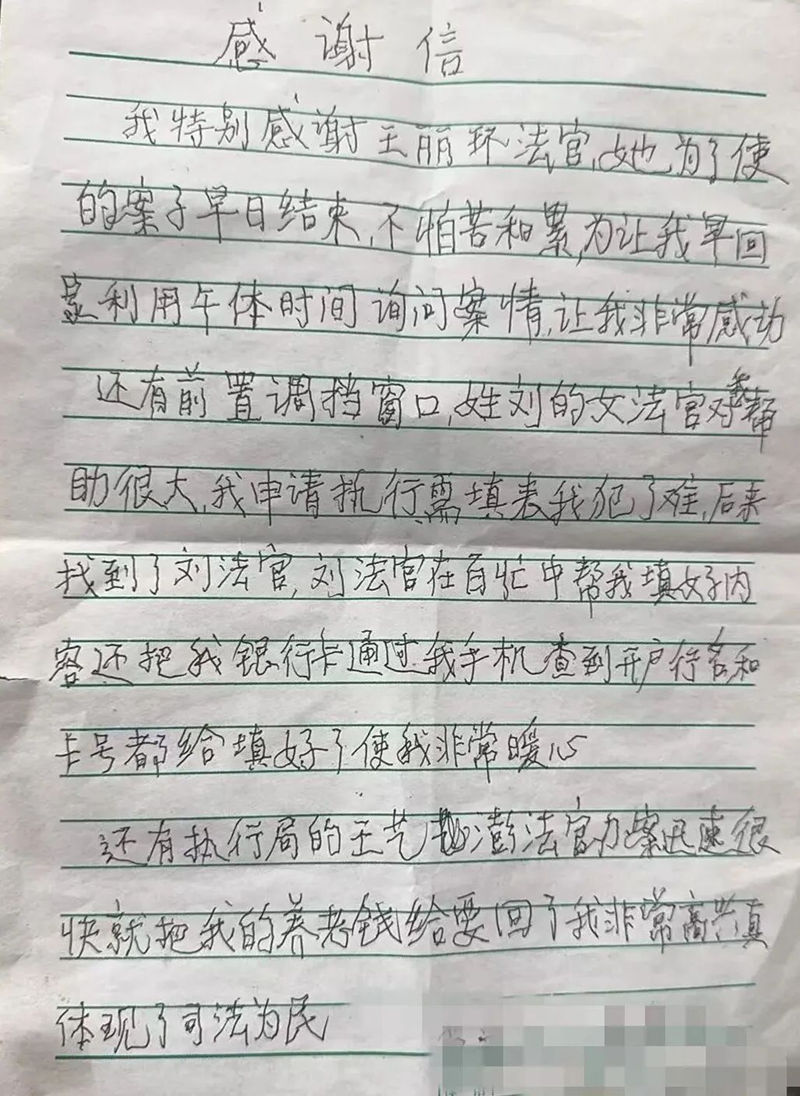 “为了让我早点回家利用午休时间询问案情,让我非常感动”、“都给填好了使我非常暖心”、“她为了使(我的)案子早日结束不怕苦和累”、“很快就把我的养老钱要回了,我非常高兴,体现了司法为民”。这是古稀老人秦某于近日在给铁锋区人民法院的感谢信中一笔一划地写下最质朴的感谢。